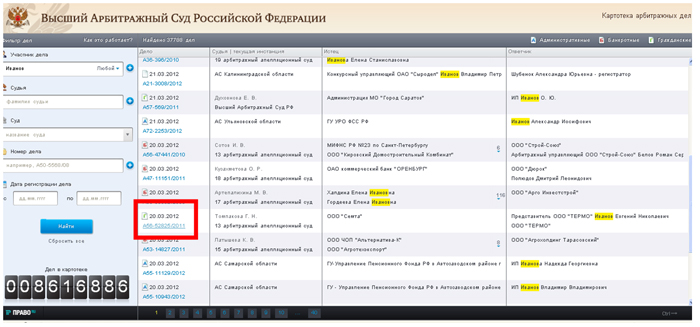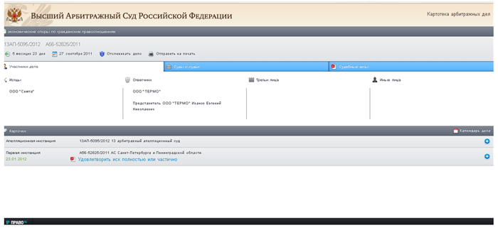 • 4) При нажатии на № дела появится возможность посмотреть подробную информацию о деле, скачать судебные акты, отслеживать дело с помощью Электронного стража и т.д.