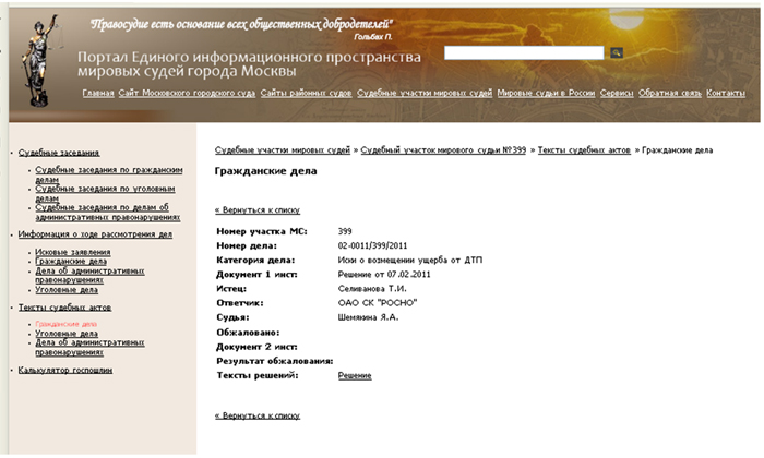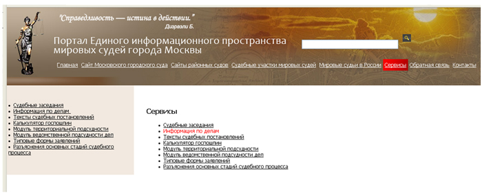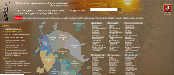 • 1) Зайти на Портал Единого Информационного Пространства мировых судей г. Москвы: http://www.mos-sud.ru/